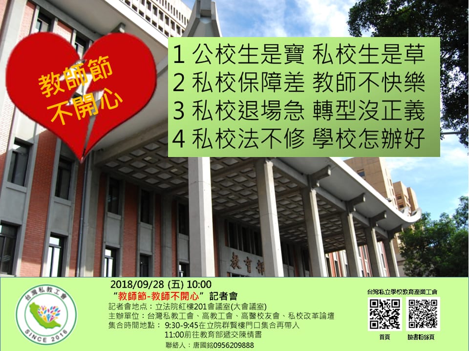 【台灣私教工會 高教工會 高醫校友會 私校改革論壇 大學法改陣線 輔仁東海大學等學團 “教師節-教師不開心”記者會 聯合新聞稿】